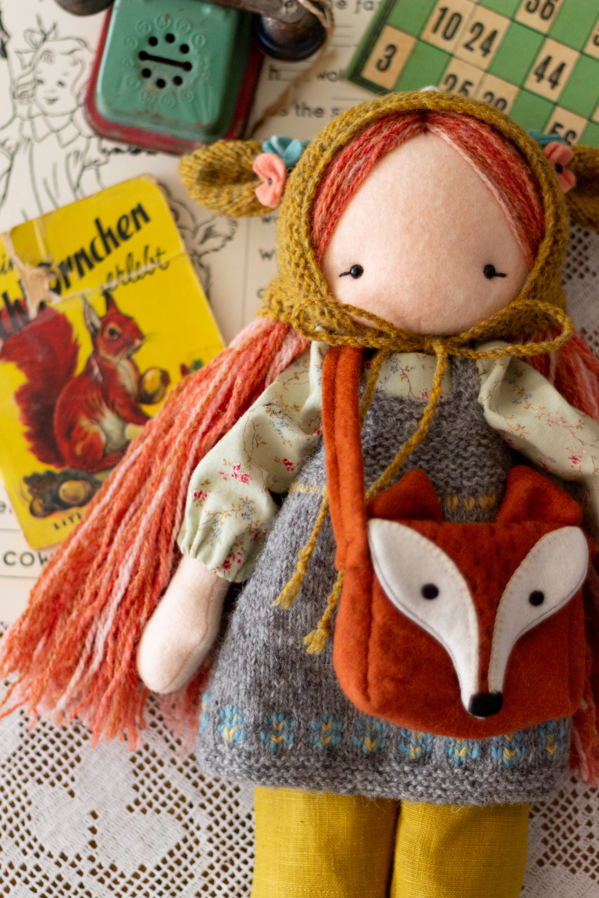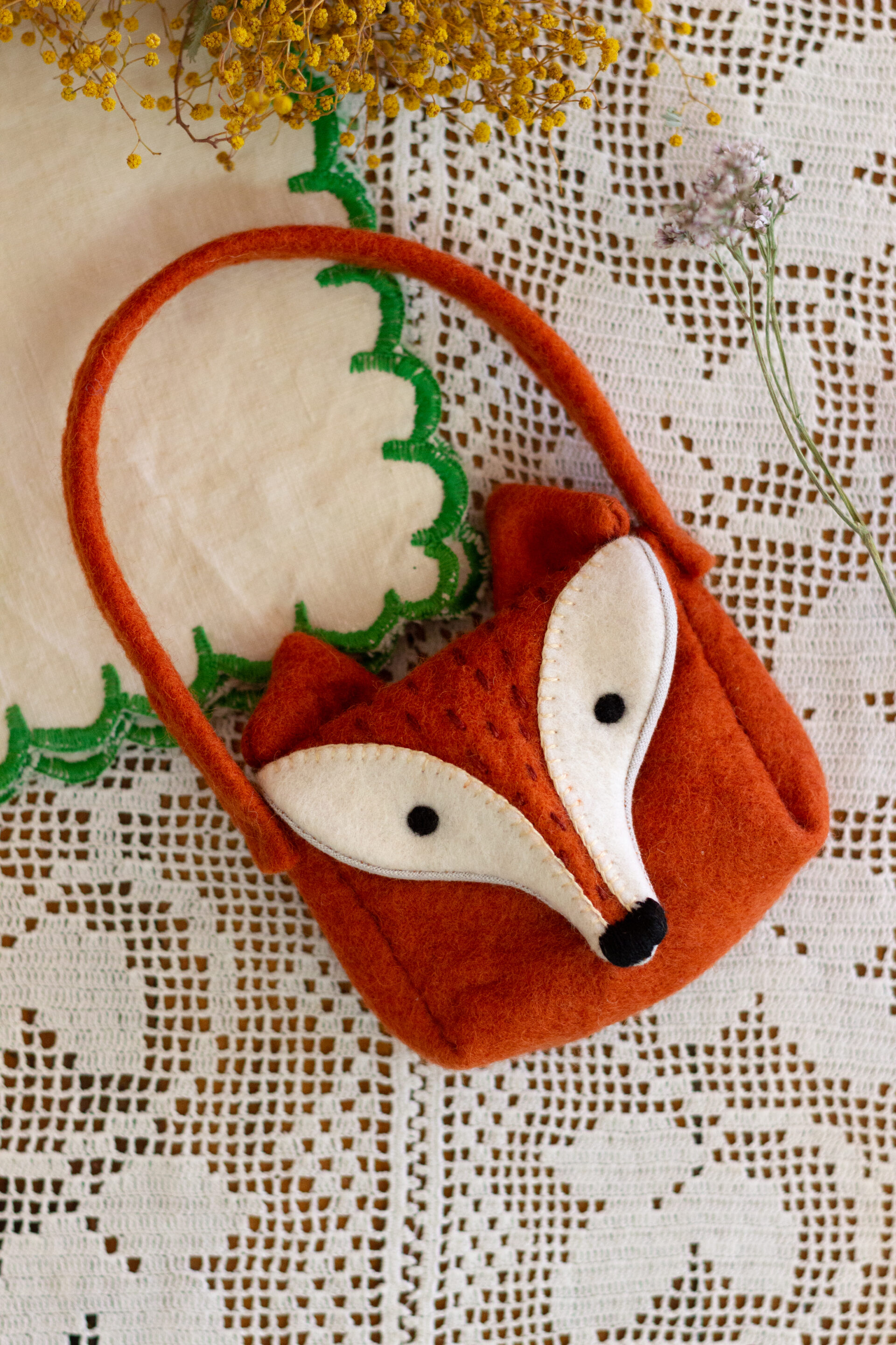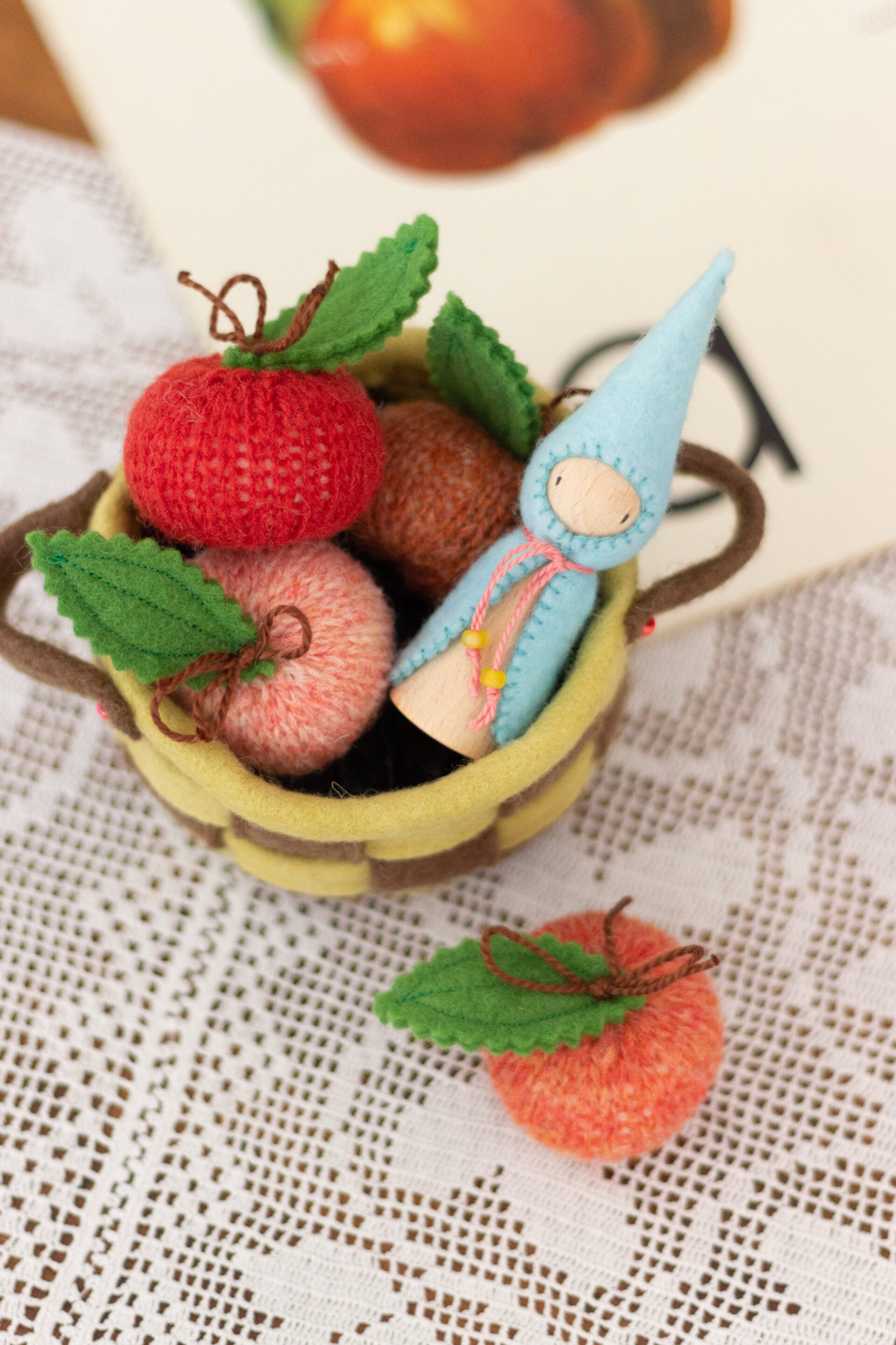 You will find a Felt Bushel for collecting the Knitted Apples, Dungarees with Applique Felt Rabbit Pockets, Fallow Deer Knitted Hat, a Felt Fox Satchel, Knitted Bobble Hat with Felt Robin and many more.
