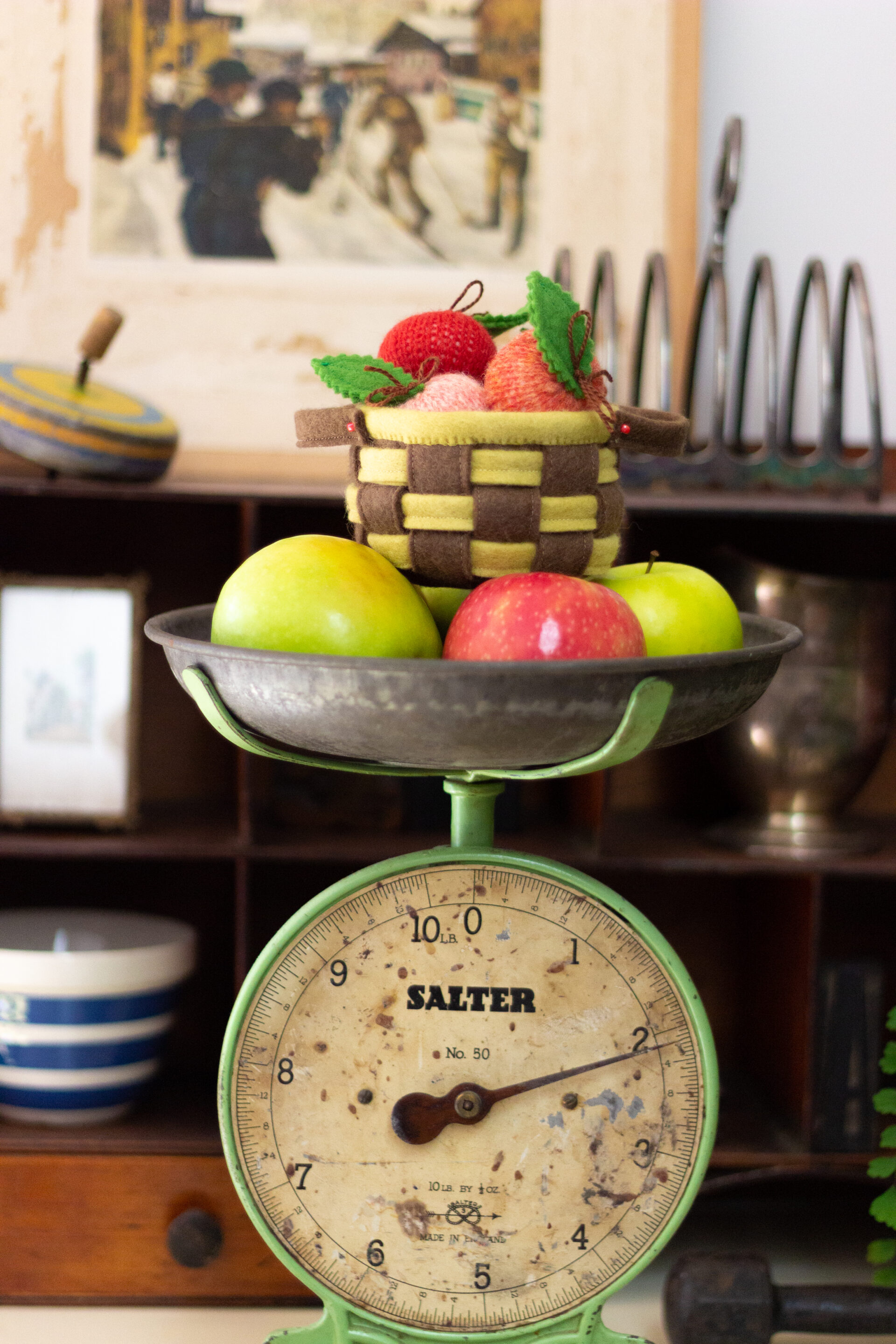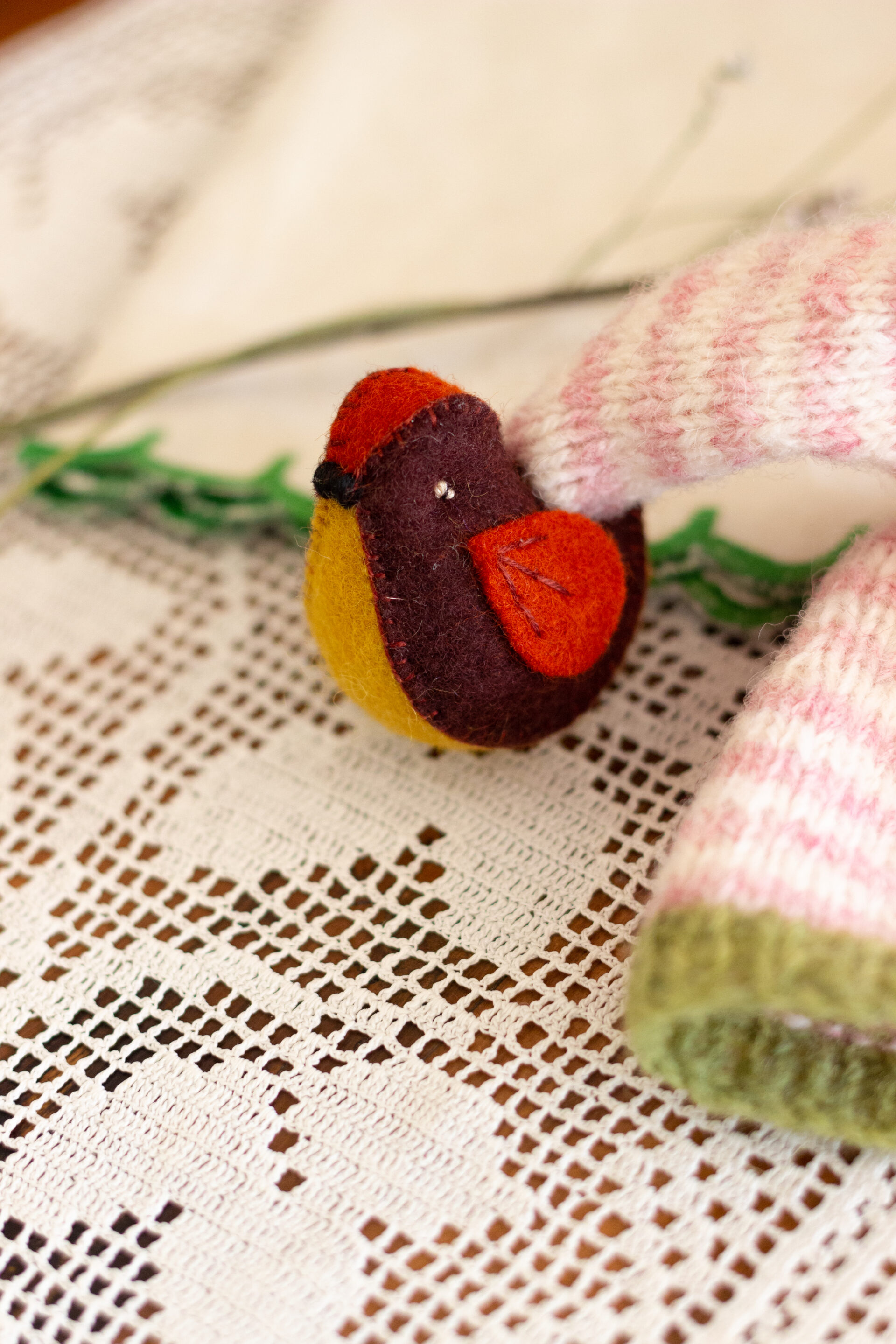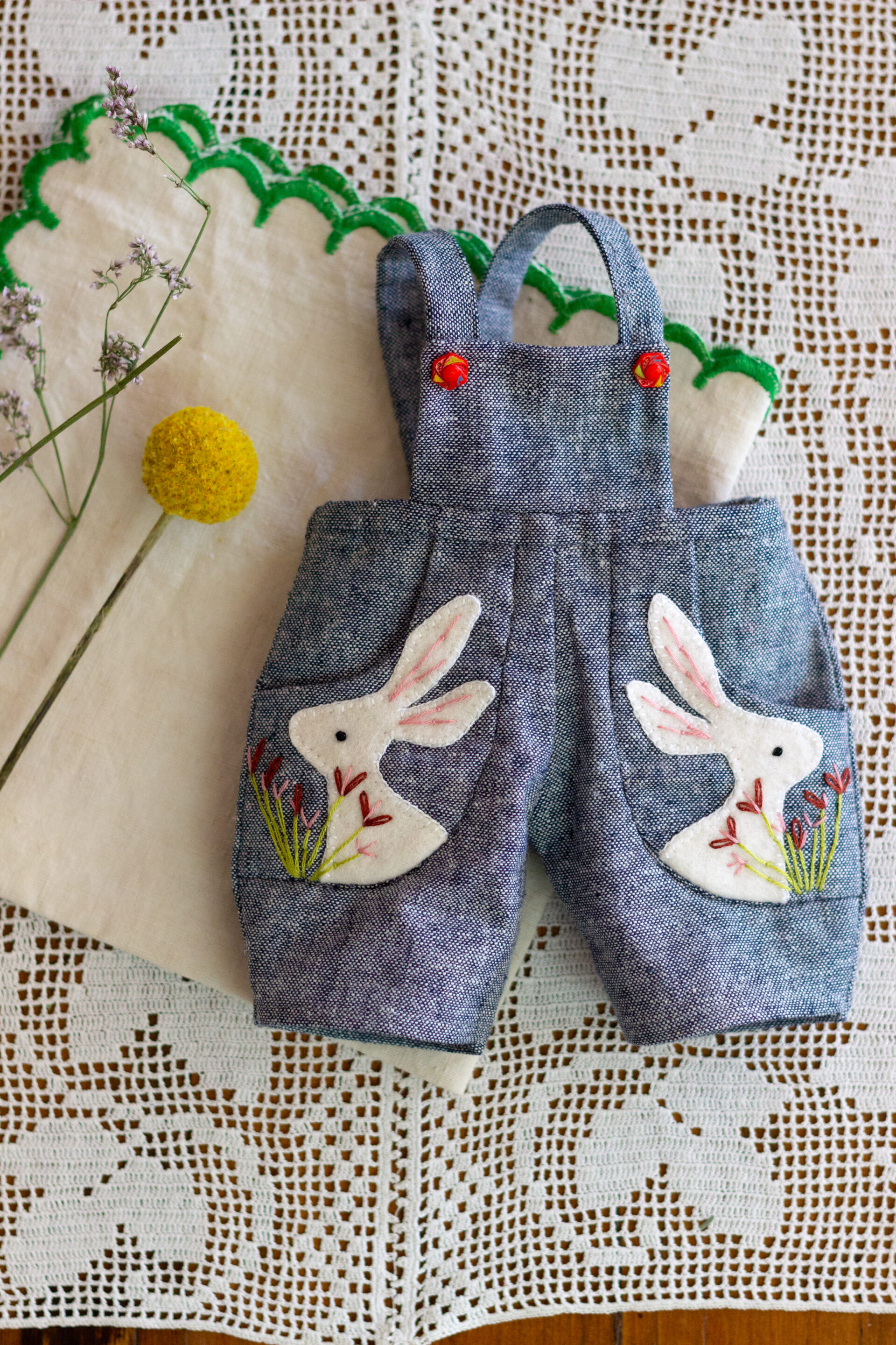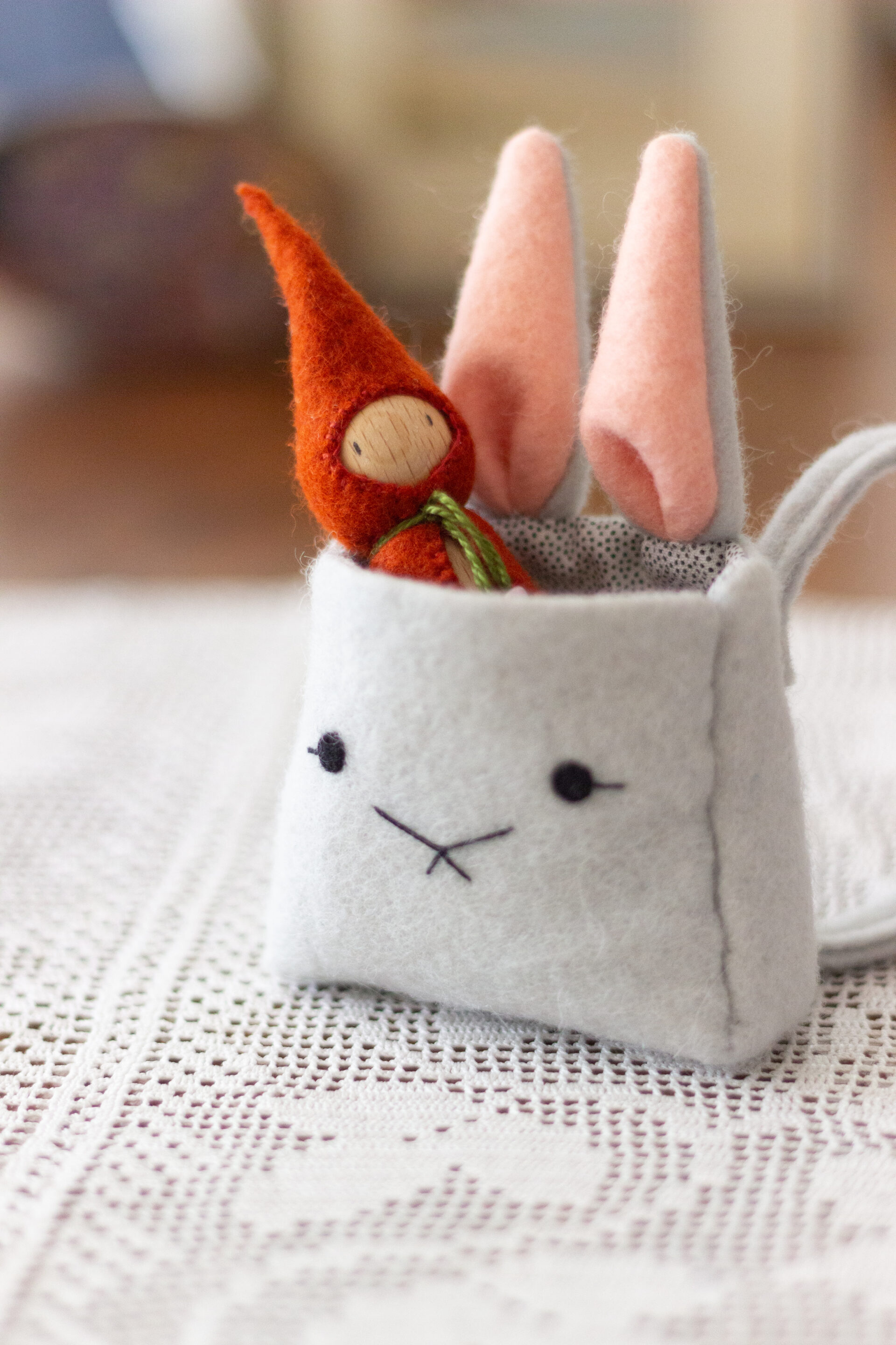 You will find a Felt Bushel for collecting the Knitted Apples, Dungarees with Applique Felt Rabbit Pockets, Fallow Deer Knitted Hat, a Felt Fox Satchel, Knitted Bobble Hat with Felt Robin and many more.